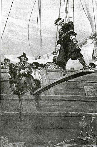 然而現(xiàn)實(shí)與藝術(shù)表現(xiàn)有著巨大的差距,歷史學(xué)家在查閱了浩瀚的史料后得出結(jié)論,這種電影里常見的海盜刑罰似乎并沒有在加勒比海時(shí)代出現(xiàn)過,唯一一次“走木板”的官方記錄出現(xiàn)在一百年后的1829年,一艘200噸的荷蘭貨船在加勒比海被海盜船截獲,在將貨物搶劫一空后,海盜強(qiáng)迫船員們依次“走木板”蹈海。只有一位船員因交待了財(cái)寶藏匿的處所而得到海盜們的寬恕,這位船員輾轉(zhuǎn)回到歐洲后向人們講述了這次可怕的經(jīng)歷,于是,“走木板”成為后世藝術(shù)作品里海盜們的招牌行徑。