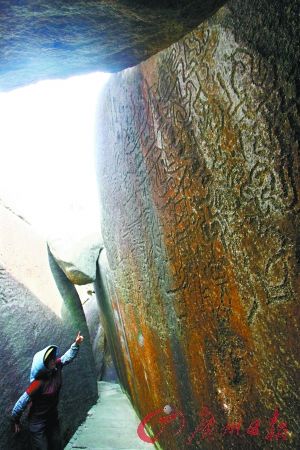我們沿山路攀爬港灣旁邊的風(fēng)猛鷹山,不久便到達(dá)其中最大一幅巖畫所在地:藏寶洞。從遠(yuǎn)處看,這只是一堆巨大的花崗石巖體,若從空中俯視,可以發(fā)現(xiàn)它像一只碩大的海蚌,微微張開一條縫,而巖畫就刻在這花崗石崩裂兩瓣后的平整的巖面上(見主圖)。