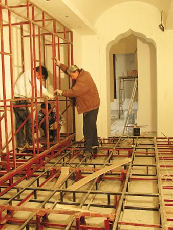 隨后,記者從左邊的長廊向大成殿的后方――冶山坡邁進(jìn)。高大的崇圣殿外一片繁忙景象,寬大的平臺上,10多名工人正在搭著鐵架,這里將是開幕儀式的主要場地,28日那天,來自全世界60個國家和地區(qū)的佛教高僧和各界貴賓將再次舉行一個特殊的盛典。而這處崇圣殿將是阿育王塔等文物的展覽圣地。