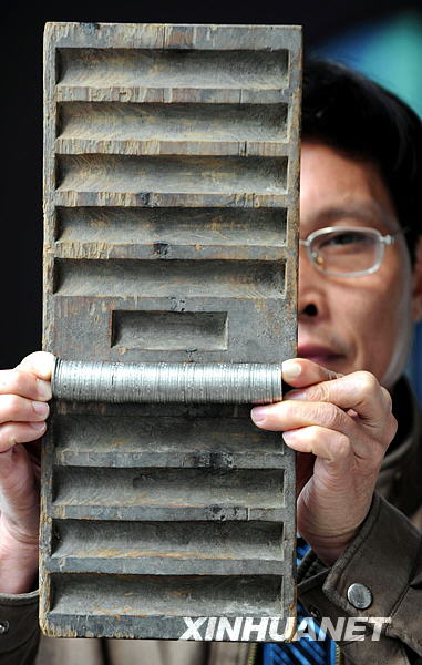 據(jù)介紹,這塊清代使用的“點(diǎn)鈔機(jī)”狀似算盤,長37厘米,寬16厘米,內(nèi)刻有11條凹槽,直徑同當(dāng)時流通的銅幣直徑吻合,其中10條長凹槽可一次性勘驗1000枚銅幣,中部的一條短凹槽可勘驗50枚銅幣。新華社記者彭張青攝