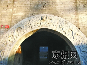 岱王廟坐落在盧溝橋西側(cè)的橋西街5號(hào),坐北面南。遠(yuǎn)遠(yuǎn)望去,岱王廟建造的十分精巧,醒目。當(dāng)?shù)匕傩账追Q它為大王廟或大廟。岱王廟的山門和戲樓,平面呈T字形布局,銜接緊密,融為一體,是一座上下二層硬脊歇山頂磚木結(jié)構(gòu)的建筑。歷經(jīng)滄桑歲月,房脊兩頭的吻獸早已蹤跡皆無,只有東西山墻頂部的鈴鐺排山,保留的還算完整。整座建筑用青磚砌成,磨磚對(duì)縫,對(duì)仗工整,呈現(xiàn)了清時(shí)期的建筑風(fēng)格。山門的一層中央是石制拱形券門,券門兩旁是各一長(zhǎng)方形豎窗。石制拱形券門刻有石雕,門首弧頂上方雕刻著探首的夔龍,在片片的祥云中翻轉(zhuǎn)騰挪,吞云吐霧。夔龍兩側(cè)各刻有兩條玩耍的蟠龍,像眾星捧月一樣游弋在探首的夔龍身邊。最為有意思的是,石制拱形券門兩側(cè)下部的石雕上,各刻有一只在水中山石間吐水的小獸,造型奇特,形態(tài)逼真,顯現(xiàn)出十分生動(dòng)有趣的畫面,給整座石雕增添了一筆頑皮的色彩。整個(gè)券門上的石雕布局嚴(yán)謹(jǐn),古樸典雅,雕工灑脫,莊重中不失諧趣,顯示出那個(gè)時(shí)代工匠們的高超技藝。