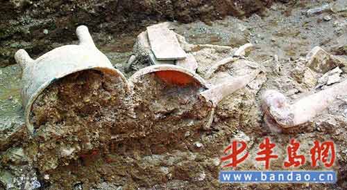 雖然這次沒有在墓葬中發(fā)現(xiàn)青銅鼎,但發(fā)現(xiàn)了簋、鬲、豆、罐等陶器,而且還發(fā)現(xiàn)了殉狗的骨骼及牛的部分骨骼。山東大學的王芬老師告訴記者,殉葬狗是當時的一種社會風俗。雖然當時處于奴隸制社會,但隨著文明的進步,已經(jīng)用殉狗來代替殉人。此外,還發(fā)現(xiàn)了周代人用來存儲糧食的窖藏遺址和丟放垃圾的灰坑。根據(jù)此次的發(fā)掘結(jié)果,青島市文物保護考古研究所所長林玉海認為這是一個周代貴族的墓地。