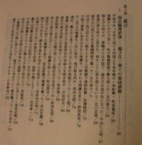 在下關(guān)刑場附近,從城中開來滿載中國人的敞篷卡車絡(luò)繹不絕,停在倉庫中間。作為海軍軍官的奧宮認出這支部隊屬于第九師團第三十六聯(lián)隊,他走進碼頭的倉庫群,看到兩手被綁在背后的十幾個中國人,被一個個拉到江岸邊幾米的地方,用軍刀和刺刀慘殺后,投入揚子江中。江中只見層層疊疊的尸體,靠近岸邊的江水為之阻塞,以肉眼幾乎難看出的速度裹挾著尸體艱難流向下游。但,有些人還沒有徹底死透,掙扎著向岸邊淺灣處逃生,那附近已經(jīng)是一片血海,因為那里等待他們的,是早有準備的槍擊和刺刀。整個過程如同流水線一樣秩序井然,連大聲指揮的人都沒有?磥恚黠@是根據(jù)上級的命令在進行。我向刑場入口的一個下士問道:"這么多中國人,就這樣安安靜靜被帶來,你們是怎么做到的?"回答是:"城內(nèi),對著在廢墟上收拾的中國人問:'有肚子餓的舉手',然后把舉手的裝上卡車作出帶去吃飯的樣子,就完成了唄。""那么,為什么用日本刀和刺刀行刑呢?""長官說,為了節(jié)省子彈。"