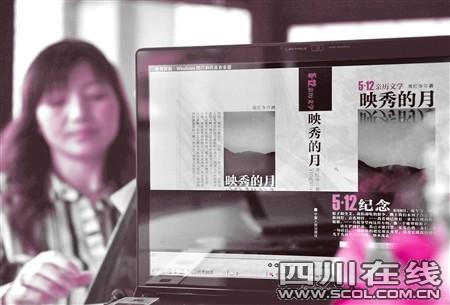 “你好,我是周紅令!毕挛2點(diǎn),周紅令帶著筆記本電腦出現(xiàn)在記者面前,她蓄著優(yōu)雅的長(zhǎng)卷發(fā),素雅的條紋襯衫剪裁合身。在成都鬧市,她有兩家玉石門市,是個(gè)有些小資的女老板。周紅令打開電腦,已經(jīng)排好版的作品《映秀的月》快速閃過(guò),一張地震時(shí)渾身是泥的照片,讓她有些羞赧。