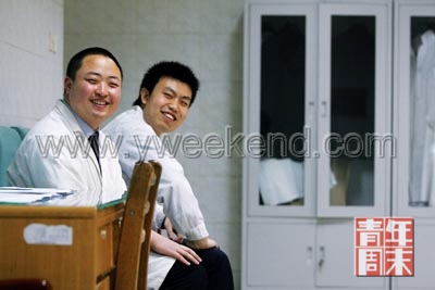 在整容室里,因?yàn)橥g,張洋和張祺關(guān)系很好。張祺相對(duì)活潑點(diǎn),他跟張洋講起昨晚做過(guò)一個(gè)夢(mèng),夢(mèng)見(jiàn)一哥們掉水里了。在夢(mèng)里他哈哈地樂(lè)著!鞍滋觳荒苄,晚上做夢(mèng)才能笑!睆堨靼腴_(kāi)玩笑地說(shuō)。有時(shí)候,哥倆做久了這份工作也感到壓抑,晚上必須找朋友喝酒。朋友都會(huì)好奇他們的工作,都覺(jué)得怎么也得一月上萬(wàn)。張洋跟記者嚴(yán)肅澄清:真的只有3000多,非常普通的工資標(biāo)準(zhǔn)。