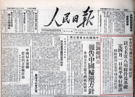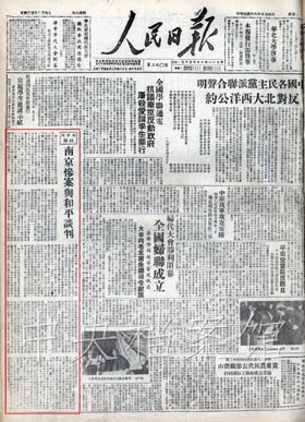 4月1日,由張治中、邵力子、黃紹竑、章士釗、李蒸、劉斐組成的南京國民黨政府談判代表團到達(dá)北平,周恩來等設(shè)宴招待。以周恩來為首席代表,林伯渠、林彪、葉劍英、李維漢、聶榮臻為成員的中共代表團,開始與國民黨代表團舉行和平談判。4月15日,形成八條二十四款的《國內(nèi)和平協(xié)定》。但結(jié)果,南京政府拒絕接受協(xié)定,徹底暴露了假和平的真面目。