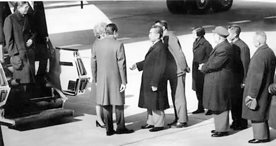 專機于上午11時30分抵達北京東郊首都機場。尼克松總統(tǒng)與其夫人并排手挽手頂著寒風,穩(wěn)步踏上專機舷梯。然后尼克松總統(tǒng)搶先一步走下舷梯,主動伸出右手,周總理小步上前,也伸出手來,兩只手熱烈有力地緊握在一起。美國國務(wù)卿杜勒斯在1954年日內(nèi)瓦會議期間拒絕與中國總理周恩來握手的時代,終于過去了。