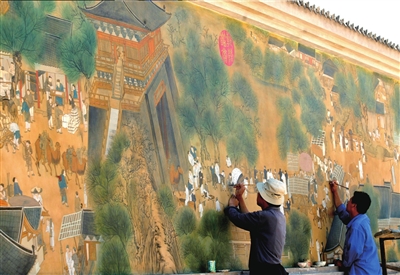 該工程是由某商業(yè)公司負責(zé)。該公司現(xiàn)場負責(zé)人劉先生介紹,該幅《清明上河圖》只是大規(guī)模壁畫創(chuàng)作的第一步!拔覀儨(zhǔn)備動員奚官營村村民,各家各戶的院墻上也畫上壁畫,使山上山下連成一體,打造‘亞洲第一壁畫村’”。目前,他們準(zhǔn)備聯(lián)合奚官營村向上級申請成立專項旅游建設(shè)項目。