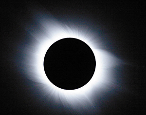 一旦太陽被完全遮住,你可以看到日冕的整個光環(huán),它的亮度和滿月差不多。通常,因為藍(lán)色的太空你看不到它。