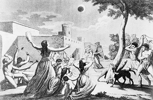 一天,兩軍對(duì)陣,激烈的廝殺一直持續(xù)到太陽偏西。忽然,士兵們發(fā)現(xiàn),一個(gè)黑影闖入圓圓的日面,把太陽一點(diǎn)點(diǎn)吞食,眩目的太陽光盤逐漸減少,大地的亮度慢慢減弱,好像黃昏提前來到。隨即,太陽全被吞沒,頓時(shí)天昏地暗,仿佛夜幕突然降臨,一些亮星在昏暗的天空中閃爍。士兵們從來沒見過這種景象,驚得目瞪口呆,停止了廝殺。