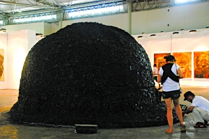 藝術家原弓將大卡車直接拉進了展廳正中最醒目的位置,一開場就讓觀眾將視角對準了汶川地震。熊貓人趙半狄也來湊了個熱鬧,展出了其2008年給災區(qū)孩子送彩色熊貓的紀實圖片。2009年圓明園鼠兔獸事件讓傅文俊的作品對準圓明園十二生肖獸首。