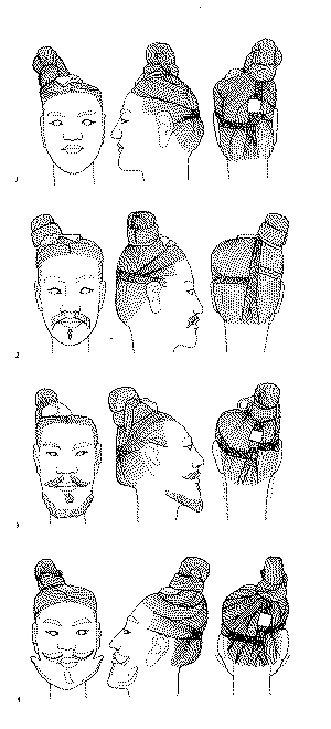 兵馬俑一向被視為秦始皇的士兵,但與一般戰(zhàn)場上的士兵不同,他們不僅沒有戴頭盔,而且梳著奇怪的“歪髻、偏髻”,頭發(fā)盤出多種多樣的花式,最后發(fā)髻歪在一旁(見右圖)。對此,一般學(xué)者認(rèn)為,兵馬俑發(fā)髻偏右,可能與秦人尚右,以右為上的觀念有關(guān)。甚至還有專家認(rèn)為陶俑頭上梳著偏于一側(cè)的發(fā)髻,是出于雕塑藝術(shù)造型的需要,是古代秦人俏皮性格的一種再現(xiàn)。但陳景元認(rèn)為這些解釋都有些蒼白。他說,兵馬俑的藝術(shù)是以寫實(shí)為主的,因此這種偏右的“歪髻”在當(dāng)時(shí)應(yīng)有一定的生活基礎(chǔ)。在其他一些楚墓中,也出土過頭上梳著“偏髻”的泥俑。問題是秦朝的士兵,是否會(huì)如此裝扮自己?陳景元說,如果將俑坑里武士俑頭上的發(fā)髻和發(fā)辮散開,這一頭的長發(fā),至少也有0.6米長。軍營里的士兵,要將自己頭發(fā)精心編成發(fā)辮,盤出各種花式的發(fā)髻,是需要花費(fèi)很長時(shí)間的,而且在水源不豐富的西北地區(qū),成千上萬的大軍要洗一次長頭發(fā)更是一種很不容易的事。