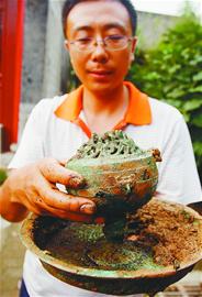 就在記者將要發(fā)稿時(shí),考古工地又傳來消息,在8月9日最新發(fā)掘的一座漢墓中,出土了幾件重量級文物:1件銅薰?fàn)t、1件鐵鼎和5個(gè)陶罐,另外在腐爛的棺木下面 還發(fā)現(xiàn)鋪有一層漢代五銖錢,其中最為珍貴的是銅薰?fàn)t。銅薰?fàn)t分為上下兩部分,上為薰?fàn)t,鏤空,有花紋;下為一圓形銅盤,直徑大約有30厘米,薰?fàn)t與銅盤可 以對插,連接后成為完整的銅薰?fàn)t,高度約為20厘米。