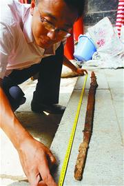 這次出土的幾件鐵器也引起了李銘的興趣。他告訴記者,別小看了這些鐵器,在漢代,這樣的鐵器屬于高檔品,不是一般人能用 的,更不是一般人能享受這樣的陪葬品的。這次出土的鐵器最重要的有3件。第一件是一柄鐵劍,已經(jīng)斷裂為5截,經(jīng)拼接后測量,其長大約1.15米。雖然劍體 銹蝕嚴(yán)重,但依然能看出質(zhì)地優(yōu)良,制作講究。劍柄的造型還基本清晰,劍箍為青銅制作。從這柄劍上,我們可以推斷很多當(dāng)時(shí)的情況,如劍長1.15米,比現(xiàn)在 一般的劍要長,這就說明使用這柄劍的人身材比較高大;根據(jù)劍的形制,可初步認(rèn)定是濟(jì)南當(dāng)?shù)刂谱,如果通過科技手段研究出劍的鐵質(zhì)及其他合金含量,這對研究 漢代時(shí)期濟(jì)南地區(qū)的冶煉史有重要的參考價(jià)值。再說鐵鼎和鐵釜,它們都是漢代時(shí)期的生活用具。其中,鐵鼎為雙耳三足折腹鼎,形狀很好。雖然現(xiàn)在看銹蝕嚴(yán)重, 但在當(dāng)時(shí)不是一般人家能夠使用的,不是官員,至少也是大戶人家,所以這對研究當(dāng)時(shí)的社會生活和陪葬習(xí)俗都有重要價(jià)值。