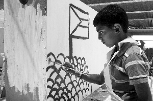 而畫家黃銳介紹,他用了一個(gè)多月時(shí)間來創(chuàng)作自己的這個(gè)作品。在他那塊“墻石”上,黃銳“玩了一個(gè)文字游戲”:從2個(gè)字母或者2個(gè)詞組合演變成20個(gè)詞,他以這種“形象記憶”記錄下在不同時(shí)間里發(fā)生的事情。