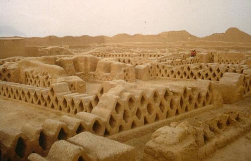 昌昌古跡位于太平洋海岸,是奇穆文明(Chimúcivilization)的首都。奇穆文明大約始于公元850年,消亡于1470年。土城城區(qū)是帝國的權(quán)力中心,帝國從厄瓜多爾南部延伸到秘魯中部,綿延1000多公里。15世紀(jì)時城市的居民達6萬人,大部分是工人,服務(wù)于極權(quán)君主,還有高級手藝人和神父。那是個嚴格的世襲等級社會:奇穆神話說,太陽用三個蛋創(chuàng)造了人類,金蛋孵出了統(tǒng)治者,銀蛋孵出了統(tǒng)治者的妻子,銅蛋孵出的是大眾。