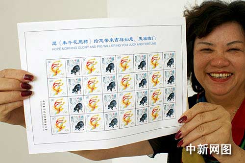 中新江蘇網(wǎng)鹽城8月17日電 (于從文 徐德鈺 李根) 上海吳女士16日來到江蘇鹽城,展示了以罕見的徐悲鴻畫豬圖為主題的個(gè)性化郵票設(shè)計(jì)效果圖。該連體郵票畫面中,一只火紅的剪紙鳳凰和一只黝黑的國畫豬相映成趣,給人以獨(dú)特的視覺感受。目前,這套郵票已經(jīng)交付印刷,將在本月底發(fā)行。