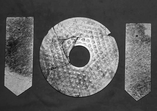 1982年,在榮成市成山頭附近的一處建筑工地上,施工人員在一處隆起的土堆下,發(fā)現(xiàn)了玉璧、 玉圭等一組三件玉器。 1979年,在同一區(qū)域,也曾出土過類似的四件玉器。