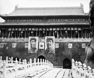 毛主席在天安門城樓上,領(lǐng)著與會(huì)者高呼:“中國人民萬歲!”“全國人民團(tuán)結(jié)起來!”“打倒帝國主義!”“建立新中國!”“全世界人民團(tuán)結(jié)起來!”“打倒帝國主義的走狗中國反動(dòng)派!”“召開新的政治協(xié)商會(huì)議,成立民主聯(lián)合政府!”“爭取全世界的和平、民主!”