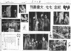 這天,北京20萬各界群眾冒雨在天安門前舉行紀(jì)念抗戰(zhàn)12周年及新政協(xié)籌備會(huì)召開的盛大慶祝會(huì)。天安門城樓上懸掛著7盞大紅宮燈,飄揚(yáng)著20面鮮艷的紅旗。城樓中央懸掛著毛澤東與朱德的巨幅畫像。兩位偉人畫像之間,掛著一顆巨大的紅星,光彩閃爍。當(dāng)天下午,大會(huì)首先鳴49響禮炮以紀(jì)念“七七”抗戰(zhàn),隨后演奏《義勇軍進(jìn)行曲》。