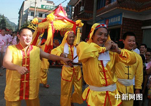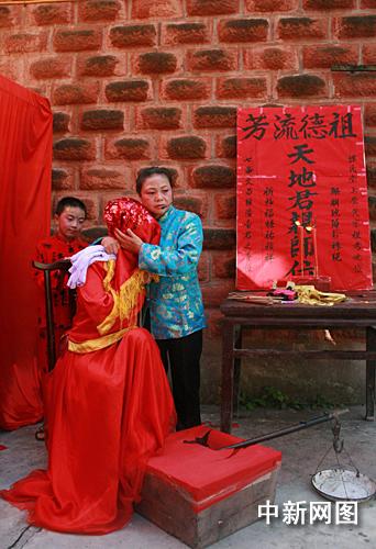 頭頂紅蓋頭的“新娘”在“出閣”前的“哭嫁”讓眾人嘖嘖稱嘆。記者在現(xiàn)場(chǎng)看到,在經(jīng)歷了踩斗、丟筷子、罵媒、父親壓轎等傳統(tǒng)習(xí)俗后,“新娘”緊緊抱著自己的“母親”哭道,“女兒家女兒外相,十七八歲選才郎,倘若奴身是男兒,早晚二時(shí)奉高堂!睋(jù)當(dāng)?shù)鼐用窠榻B,“哭嫁”的順序?yàn)榭薜铩⒖迡饗、哭叔娘和哭姐妹。不少情侶在看完“新娘”的“哭嫁”完后,連連稱贊其“哭功”了得,堪稱一絕。隨后,“新娘”由“哥哥”背上花轎。穿長馬褂、胸戴大紅花的“新郎”則坐上另一臺(tái)轎子,帶著女方配置的婚嫁用品浩浩蕩蕩地返回“新郎”家。