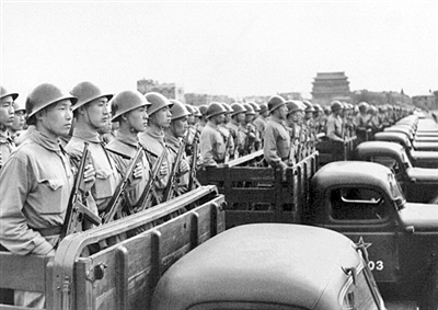 陸、海、空三軍佩戴統(tǒng)一制式的帽徽和胸章,著50式軍服受閱,整齊劃一,面貌一新。新中國成立后我軍第一次有了統(tǒng)一制式、統(tǒng)一標準的軍服。