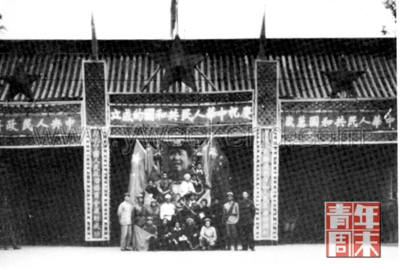 在《義勇軍進行曲》和禮炮聲中,毛主席按下電鈕,把第一面五星紅旗緩緩升起。 5000多只和平鴿沖向藍天。毛主席在天安門城樓上向全世界莊嚴宣告:“中華人民共和國中央人民政府今天成立了。”廣場上一片歡騰……