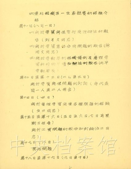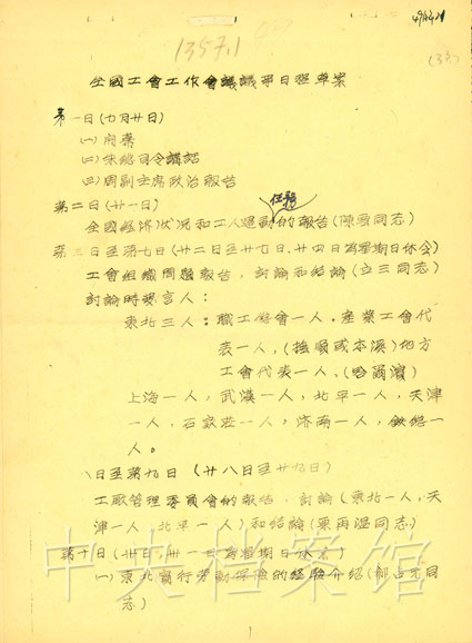 1949年7月23日至8月16日,全國工會工作會議在北平舉行。出席會議共有省、市、區(qū)72個單位的代表254名。毛澤東、朱德、周恩來等先后到會講話,李立三作了關(guān)于工會組織的報告。這次會議規(guī)定了當(dāng)時全國工會工作的中心任務(wù),就是在一年左右基本上把全國工人階級組織起來,以便在新中國的政權(quán)建設(shè)和經(jīng)濟(jì)建設(shè)中勝利地?fù)?dān)負(fù)起領(lǐng)導(dǎo)階級的歷史使命。會議通過了《關(guān)于勞資關(guān)系暫行處理辦法》等四個文件,明確了在新民主主義政權(quán)下處理勞資關(guān)系的正確途徑。