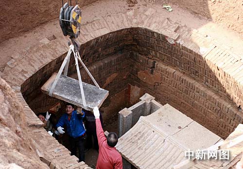 據(jù)了解,八月下旬,西安國家民用航天產(chǎn)業(yè)基地在長安杜陵塬上修建道路時發(fā)現(xiàn)一座古墓,西安市文物保護(hù)考古所經(jīng)過清理發(fā)掘,使這座唐代廡殿式石槨墓葬完整地展現(xiàn)在世人面前。九月二十七月,考古人員將這座墓葬內(nèi)的文物實(shí)施整體搬遷。首先對墓葬內(nèi)的石槨進(jìn)行拆解編號,隨后用吊車將每塊文物起吊到地面上用毛氈包裹,用龍骨、鐵絲加固后裝上一輛封閉式的卡車內(nèi)。