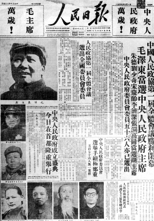 當(dāng)時的《光明日報》不屬于我黨領(lǐng)導(dǎo),而是由其它黨派主辦的。然而,從《光明日報》的立場傾向看,它的“親共”色彩非常濃厚,積極踴躍的態(tài)度甚至超過了我黨領(lǐng)導(dǎo)的一些報紙。譬如,在10月1日這一天的報道中,《光明日報》的頭版頭條消息顯得非常突出,標(biāo)題“中華人民共和國誕生”以前所未有的大而粗的黑體,既宣示了主題,又一下子抓住了讀者的眼球。這9個字之大之粗,不僅超過了《光明日報》自身的報頭,而且是當(dāng)時任何其他報紙包括《人民日報》的標(biāo)題都無法比擬的。它似乎表達了《光明日報》特別興奮的心情,表明了站在共產(chǎn)黨一邊的鮮明立場。當(dāng)日二版,安排了以毛澤東主席像居中、朱德等6位副主席像居兩邊的突出版面;當(dāng)日三版,安排了56位中央人民政府委員的標(biāo)準(zhǔn)像。這樣的版面安排,在聲勢上、氣魄上、膽識上,均壓倒了其它所有報紙,說明《光明日報》的編輯意識特別富有想像力,它的編輯手段特別富于創(chuàng)新形式。當(dāng)日一版的社論《偉大的光榮的日子》也是寫得激情澎湃,指出: