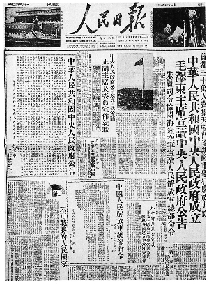 “ 共產(chǎn)黨的新聞機構(gòu)報道,約二百萬人聚集在一起收聽這個歷史性的宣告,所有人的目光都聚集在毛澤東升起的那面新中國的標(biāo)志——五星紅旗,樂隊演奏新國歌《義勇軍進行曲》。其后,舉行游行儀式。軍隊接受朱德將軍的檢閱,編隊經(jīng)過天安門,有的配備最新的美國大炮、坦克以及從國民黨手中繳獲的裝甲車。共產(chǎn)黨空軍轟炸機編隊飛行,煙花爆竹和其他游行活動直至深夜。有報道指出,這種歡慶活動將持續(xù)3天左右,與推翻清政府統(tǒng)治的‘雙十節(jié)’共慶!