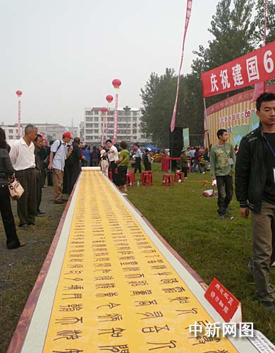 中新社襄樊9月29日電 (涂玉國(guó))長(zhǎng)一百一十米、寬零點(diǎn)八米,用五種字體書寫的毛主席詩(shī)詞的書法長(zhǎng)卷,二十九日在湖北省襄樊市谷城縣博覽會(huì)上現(xiàn)身。這是該縣文化館副館長(zhǎng)、書法美術(shù)家協(xié)會(huì)主席許祥強(qiáng)為慶祝新中國(guó)成立六十周年而作。