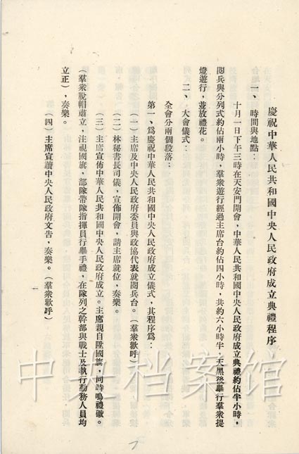 1949年1O月1日下午2時(shí),中華人民共和國(guó)中央人民政府委員會(huì)召開(kāi)第一次會(huì)議。會(huì)上毛澤東宣布中央人民政府主席、副主席和委員就職,中華人民共和國(guó)中央人民政府成立。3時(shí),中華人民共和國(guó)中央人民政府舉行成立典禮。參加典禮的有中國(guó)人民政治協(xié)商會(huì)議全體代表和首都各工廠職工、學(xué)校師生、機(jī)關(guān)人員、市民、近郊農(nóng)民和城防部隊(duì)共3O萬(wàn)人。中央人民政府主席、副主席、各委員就位,樂(lè)隊(duì)奏國(guó)歌。