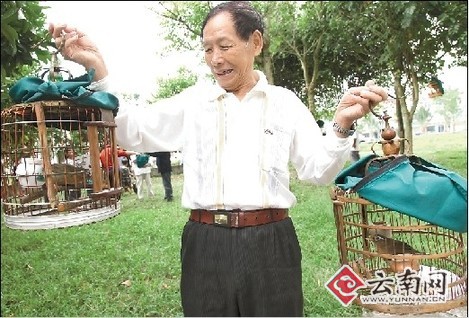 上午11點,結(jié)束了當天的鳥市后,勐捧農(nóng)場武裝部職工何保平的一只畫眉鳥得到了冠軍!氨緛砣ツ暧腥碎_價1.5萬元都沒有搞到手,不過今年由于它原來的主人忙著要去打理生意,被我3600元就撿個大便宜買了下來!焙伪F脚d奮地對記者說:“不過,我們這里有一個沒有人敢挑戰(zhàn)的鳥王!闭f話間,他將記者領到了一位正把玩著兩個鳥籠、精神矍鑠的老人面前,告訴記者,他就是這一帶公認的“鳥王”張陸成。