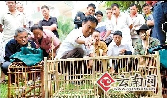在勐捧農(nóng)場場部,很多膠工和附近的村民在凌晨割完橡膠后,就提起自己的愛鳥,匆匆趕到鳥市來遛鳥,至上午10點左右,又匆匆離開鳥市返回膠林收膠。但更多的人卻沉浸在鳥市之中,各自將鳥籠的活動門與大鳥籠對接后,兩只躍躍欲試的畫眉鳥就會進入大鳥籠一決雌雄。兩只小鳥在籠中紅著眼睛望著對方,振翅或用嘴啄、或揮爪攻,各使絕技展開肉搏,一旦不敵對方后退,勝利一方也由于有隔離欄而無法隨興趕盡殺絕。這時,心疼自己愛鳥的主人一般只需將活動門關上,兩只廝殺完畢的小鳥就會各自回到自己的籠中。