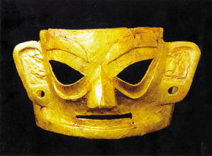 “儺”,指人們在特定季節(jié)驅(qū)逐疫鬼的祭祀儀式。這個祭祀儀式最大的特點(diǎn)是驅(qū)逐疫鬼的人必須帶上青銅面具。馮廣宏說,“在古代,面對瘟疫和戰(zhàn)爭時人們會首選‘儺’法,特別是在推崇神靈的殷商時代,直到漢代宮廷里每年還舉行大儺!比嵌殉鐾廖奈镏杏幸粋黃金面具,馮廣宏認(rèn)為,在上古儺文化里就有“黃金四目”的法師在施行驅(qū)趕疫鬼的儺法。而載歌載舞、繁瑣復(fù)雜的“儺”儀式中有許多配套的青銅面具和法器,“儺”儀式結(jié)束后,這些青銅面具和法器被認(rèn)為已沾染了“鬼氣”,所以要全部砸毀,焚燒后埋入土中。