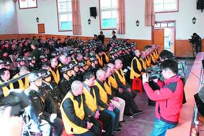 8時30分,庭審正式開始。宣布完法庭紀律后,審判長一聲令下:“傳被告人到庭!”緊接著,27名身著橘色背心的被告人被帶上法庭。被告人在魚貫而入時,均不時向旁聽席上張望,而旁聽席上也傳來一陣細細的抽泣聲。