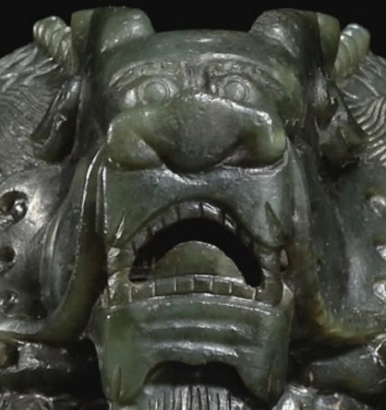 李教授同時指出此次拍賣的“八徵耄念之寶”印龍爪、頭部紋飾雕工疲弱而少章法、刀法。龍的發(fā)紋不上沖,火焰紋并不上揚,龍爪粗野乏力、沒有抓力,缺乏動感,似走獸類臥伏在地面一般,龍脊拱沿處造型用,用刀不干凈表現無弧勢,顯出臃腫、毫無生氣,因造型力度沒把握好,鼻部中軸整塊竟不居眼、口正中,電腦圖片放大后看到門牙和邊牙竟上下鋸裂,此應為機雕出了差錯留下的殘缺,龍的形狀與面部表情呈驚恐狀,毫無龍威,粗糙得象磚雕,更無皇家氣象(圖五)。而拍賣玉璽竟煞有介事地配了個底坐“以舊充好”,以示此玉璽大有來歷,作偽者殊不知清宮玉璽多封黃綬帶(配綬帶寓意長壽,也是使用方便),并承之以紫檀木匣。大部分寶匣并加以雕工或描金,以彰顯出玉璽的尊貴與皇家氣象。