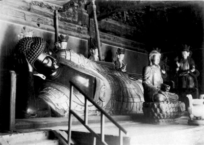 西山臥佛寺的老照片更讓文史工作者吃驚不已,照片中巨大的5萬(wàn)斤臥佛腹前,竟然還有一尊端坐蓮花座、有臥佛四分之一大小的坐佛。而在古籍中,并沒(méi)有臥佛前還有一尊坐佛的記載。因此,西山臥佛寺有了兩個(gè)謎團(tuán):即元代沒(méi)有大型運(yùn)輸設(shè)備,重達(dá)25000公斤的臥佛是怎樣運(yùn)上山的?臥佛前何時(shí)有了小坐佛?目前,這些問(wèn)題正在進(jìn)一步考證。