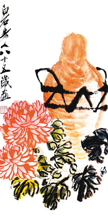 《菊酒圖》鮮明體現(xiàn)了白石老人“紅花墨葉”的花鳥畫風(fēng)格。畫中一叢秋菊,一壇老酒,構(gòu)圖簡約;^以牡丹紅勾勒而出,與酒壇的赭石色一起構(gòu)成了明艷熱烈的主色調(diào),渲染了豐收后喜悅的情緒。此畫艷而不俗的關(guān)鍵,在于其用筆勁健生辣,不失文人畫的筆墨傳統(tǒng)。同時菊葉、酒筐及題款都是黑重色,對主色調(diào)進(jìn)行了有效的制衡,使畫面顯得富麗而穩(wěn)重,韻味無窮。