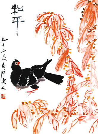 《和平鴿》是一幅以動物為主體的上乘之作。齊白石一生對生活充滿熱愛,其筆下花鳥蟲魚,乃至蟬、蝶、蟋蟀等小昆蟲,皆充滿情趣,寄托和凝聚著他內(nèi)心的天真與童趣。鴿子是白石老人很喜愛的題材,他曾親自飼養(yǎng)鴿子,觀察其體態(tài)神韻,創(chuàng)作態(tài)度嚴(yán)謹(jǐn)。該畫右側(cè)是一叢鮮艷的雁來紅,兩株并立,一株斜插,枝葉披紛,繁而不亂。在紅花之下,站立著一只通體漆黑、紅嘴紅爪的和平鴿,雙目圓睜,回首眺望,極顯精神。鴿子雖是大寫意畫法,但結(jié)構(gòu)造型精準(zhǔn)。此畫僅黑紅二色,卻營造了熱烈而穩(wěn)重的氛圍。題款“和平、九十二歲白石老人”不僅點明主題,而且在全畫以“面”為主的構(gòu)圖中,制造了“點、線”元素,使作品形式更為豐富。