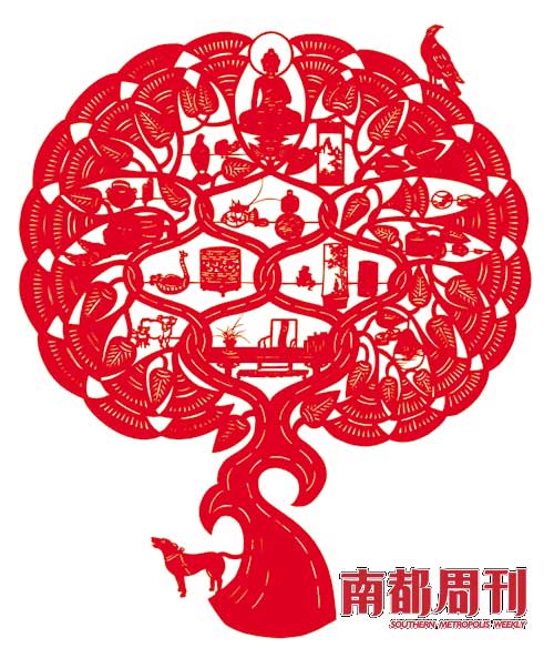 袁荃猷女士刻的這幀“大樹圖”剪紙,形象勾畫出了王世襄一生的15種愛好,這其中有代表王世襄最主要學(xué)術(shù)成就的漆器,還有王世襄使之死而復(fù)生的傳統(tǒng)工藝竹刻、葫蘆器,還有繪畫、鎏金銅佛像、蟋蟀、家常菜、大鷹、獾狗等。