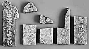 墓地出土(或從盜墓賊處繳獲)的石牌和石枕,有關(guān)方面認(rèn)為是根本性的確證。圖一中有兩塊石牌寫著魏武王大戟,這是很有意思的,因?yàn)槲覀兛吹降氖鞘撇皇俏淦麝旧。牌子是說明實(shí)物的,如何根據(jù)牌子證明這就是曹操的墓地呢?牌子上面寫著魏武王常用格虎大戟,表明這是在說明商品的名稱,而不是說這是曹操的遺物。再看圖二計(jì)21枚牌子,這些牌子上面都有孔,以作懸掛用,上面寫的多是物品名數(shù),如胡粉二斤、黃豆二升之類。如果把這些看成是遺物陪葬,那就不免奇怪了。因此這些所謂遺物應(yīng)該是陳列的商品招牌,那么這幾間陰室要么是做過倉庫,要么就是堆放過商品。而這些牌子只是為了說明記錄這些貨物用的。從稱呼上看,曹操生前先封為“魏公”,后賜九錫,進(jìn)爵為“魏王”,死后謚號(hào)為“武王”,其子曹丕稱帝后追尊為“武皇帝”,史稱“魏武帝”。出土石牌、石枕刻銘稱“魏武王”,名稱倒是不錯(cuò),但石枕形貌不是生活中可以適用的物品,應(yīng)該出自偽造。從物品所刻字體看,刻工水平很差,所以只能是來自民間藝人所作,因?yàn)閺谋I墓人手中獲取,也不排除盜墓人游戲之作。