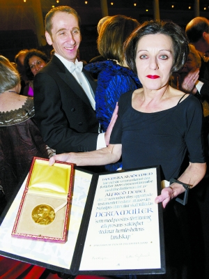 當(dāng)赫塔·穆勒從瑞典國王手中接過裝有獎(jiǎng)?wù)潞妥C書的紅色小皮匣后,遵照儀式禮節(jié)先后向皇家成員、瑞典皇家學(xué)院院士和觀眾席深深鞠躬以示感謝時(shí),掌聲經(jīng)久不息。