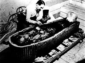 圖坦卡蒙陵墓的發(fā)掘被認為是考古學史上最榮耀的時刻之一。墓穴的四個房間里發(fā)現(xiàn)了超過五千件以上的陪葬品,包括家具、香水瓶、蒼蠅拍和鴕鳥毛等。最重要的是,卡特發(fā)現(xiàn)了一具重約134.3公斤黃金打造的棺槨,找到了戴黃金面具的圖坦卡蒙王木乃伊。