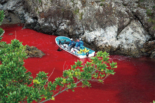 受到驚嚇的海豚在海灣凹口內(nèi)四處游竄,周圍的海水已被海豚的血水染成紅色。有些母海豚為了告知幼海豚有危險并試圖保護(hù)它們時,往往發(fā)出極度痛苦的鳴叫。絕望的叫聲加上觸目驚心的血水,讓這一幕顯得即凄慘又血腥。