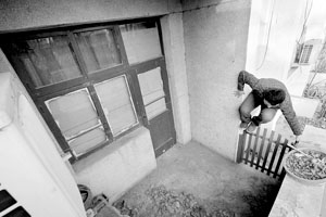 記者看到,陽(yáng)臺(tái)和樓道內(nèi)的屋門(mén)已鎖。陽(yáng)臺(tái)上破損的窗戶(hù)尚未修復(fù),仍保留著警方勘察現(xiàn)場(chǎng)時(shí)所貼的標(biāo)尺條。但窗戶(hù)內(nèi)側(cè)已用木板釘上,無(wú)法看清屋內(nèi)狀況。