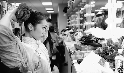 序幕里,周巖扮演的“和諧少女”在舞臺上空飛過,造型驚艷,一下子就調動起了觀眾的情緒。但在第一次吊威亞培訓時,她哭了。“為了安全,腰上要系得特別緊!痹谔焐系踔臅r候沒有什么感覺,結果腳一著地,“就疼哭了”。