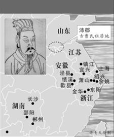 通過(guò)對(duì)這一百多件族譜的全面查閱、辨別梳理,曹操后裔可能的分布遷移圖逐漸顯現(xiàn),甚至精確到縣——古曹氏主要在漢時(shí)名為沛郡的地方活動(dòng),也就是如今江蘇北部、安徽的一部分、河南到山東交界地區(qū)。從族譜的反映情況來(lái)看,此后曹家發(fā)生了很大的遷徙,方向往南走的居多,且主要是分布在長(zhǎng)江流域,如浙江的東陽(yáng)、蕭山、紹興、余姚、金華,江蘇的宜興、鎮(zhèn)江,安徽的涇縣、歙縣、績(jī)溪,湖南的郴州、益陽(yáng)、長(zhǎng)沙,甚至包括上海。