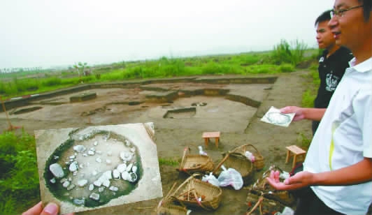 去年7月,本報記者前往發(fā)掘現(xiàn)場采訪,當(dāng)時已從遺址中發(fā)掘出眾多陶器碎片,還有一些無法辨別材質(zhì)的物品,其神秘性為剛剛開始發(fā)掘的遺址留下懸念。在隨后的發(fā)掘過程中,省文物考古研究院除調(diào)集本院的大量專業(yè)人員外,還邀請和組織了包括北京大學(xué)、南京大學(xué)、四川大學(xué)、重慶市文物考古研究所等單位的專業(yè)技術(shù)人員。